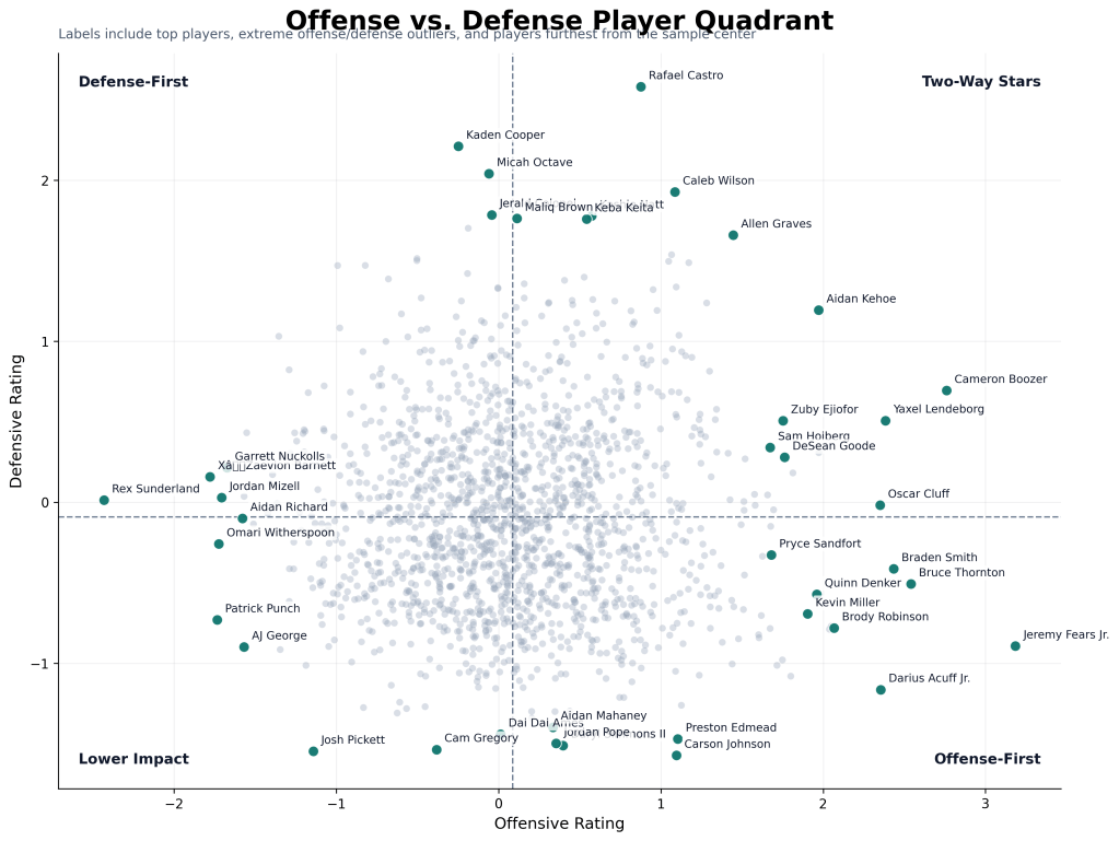 - Some high scorers fall into offense-only profiles, highlighting limitations in overall impact