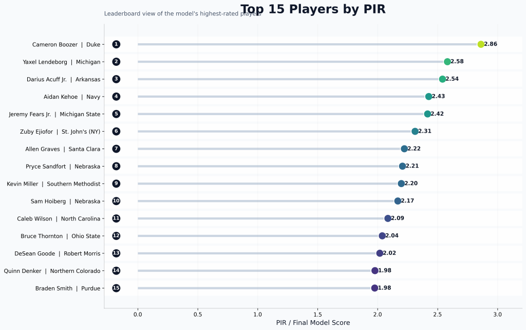 PIR produces a top tier of players who combine efficiency, responsibility, and two-way value. The model’s highest-ranked players include: